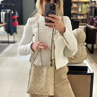Coach Mollie Bucket Bag, geniş iç hacmi ve şık tasarımıyla öne çıkar. Günlük kullanım ve özel davetler için uygundur. Omuzda rahat taşınabilir.